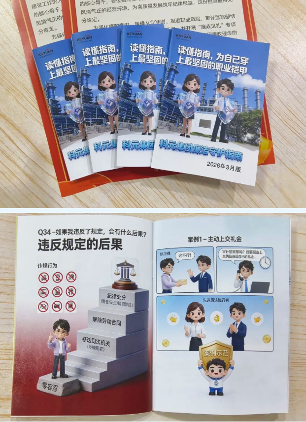 清风养正气,廉洁护征程。为纵深推进廉洁文化建设,拧紧全员廉洁从业 “思想阀”,集团审计监察部开展“廉政见礼”专项行动,精心派发《科元集团廉洁守护指南》实体手册与《致员工的一封信》两份廉洁礼,以纸为媒传廉情、明规矩,让廉洁关怀与纪律要求直达人心,筑牢企业清廉防护网。